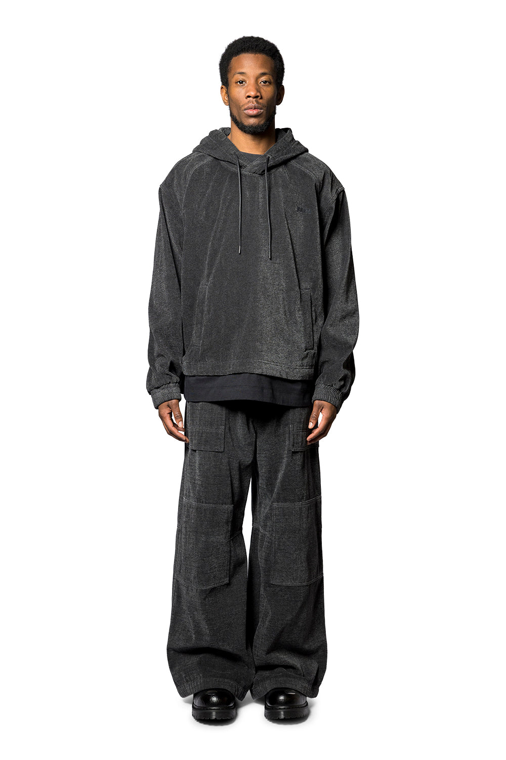 Produced in a limited run to preserve exclusivity and enduring value, these pants offer a versatile foundation for year-round wear. The deep black rinse remains timeless, while the double-knee construction delivers quiet functionality to a refined profile. This piece embodies Juun.J’s philosophy of elevating everyday denim through precise tailoring and thoughtful texture—a collectible that ages with grace as part of a curated wardrobe.