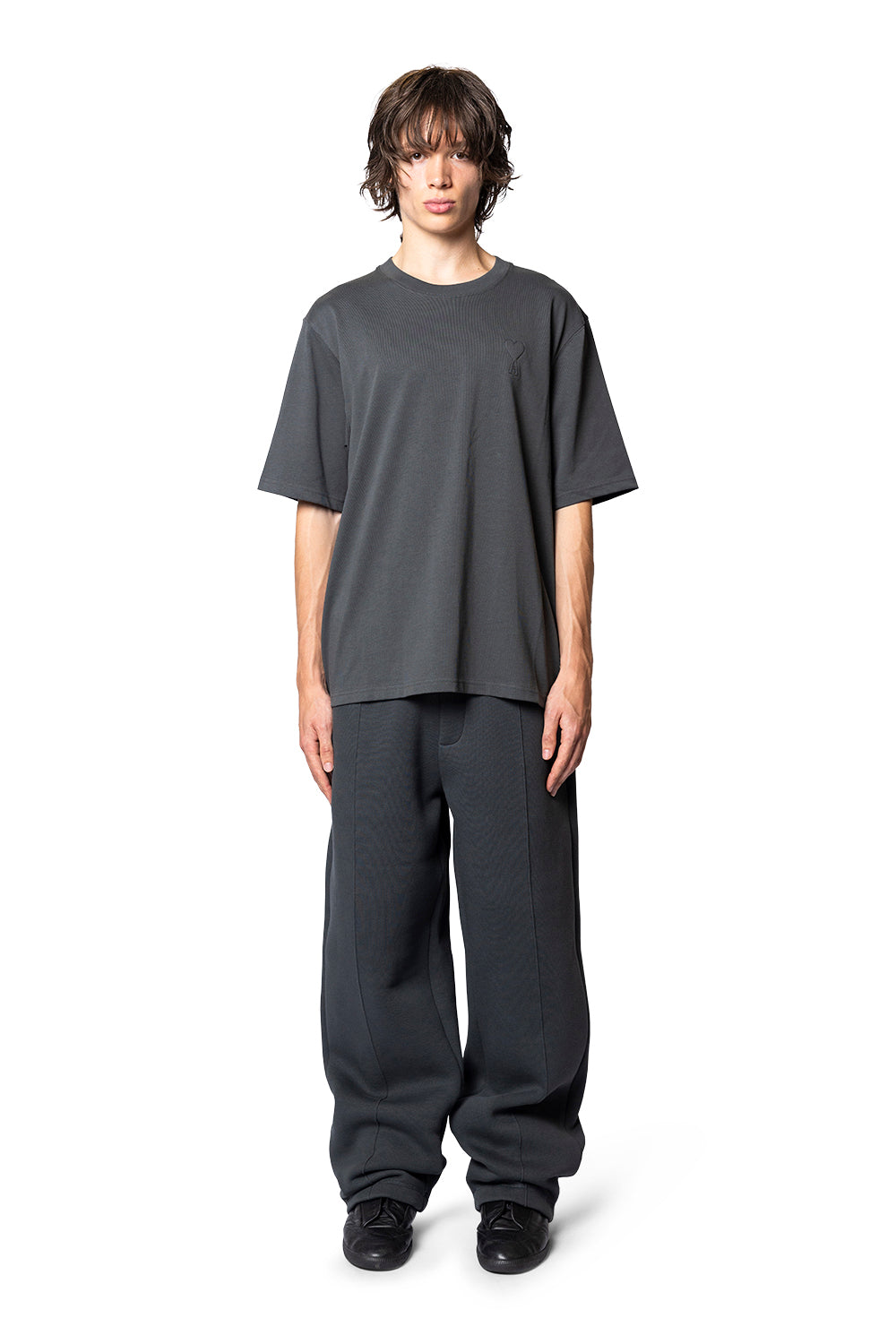 BIG ADC Embossed T-Shirt Anthracite from AMI Paris exemplifies contemporary Parisian luxury in its most understated form. The heavyweight organic cotton jersey offers a structured drape with a soft, enduring hand, while a boxy silhouette reads modern and timeless. The chest bears AMI’s signature heart motif in a tonal emboss, a quiet mark of refinement that signals provenance without shouting.