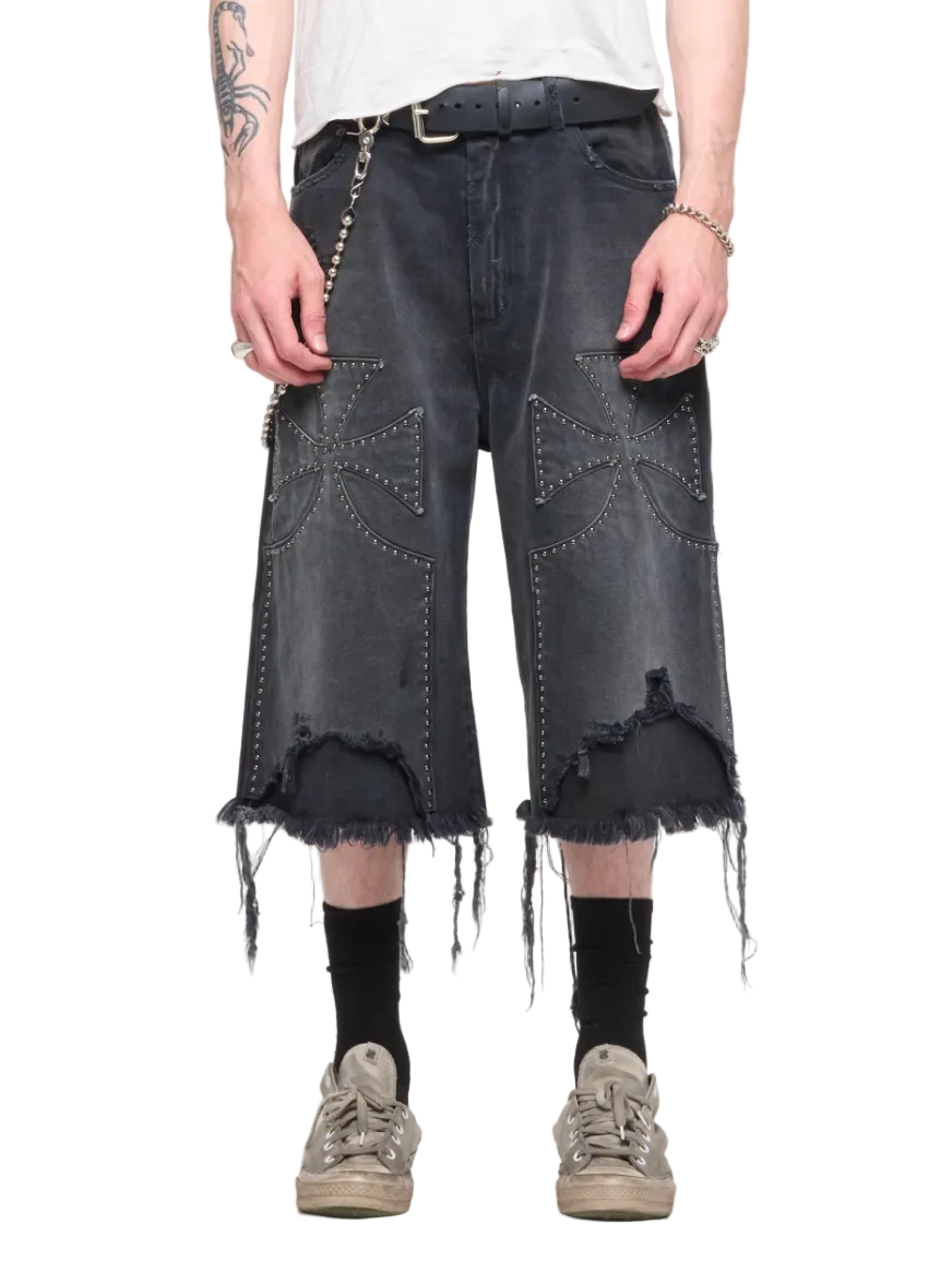 Elevated by SEKRIT SAINTS, the Studded Chopper Short in Washed Black embodies a refined balance of rugged utility and quiet luxury. Cut from premium denim and finished with a deep, storied wash, it evolves with wear, gaining a personal patina while preserving a crisp, defined silhouette. The hardware and studs are deliberately restrained, allowing the craftsmanship to read through texture and line. This piece carries provenance in every stitch—a deliberate, handcrafted approach that honors longevity and invites a lasting relationship with the wearer.
