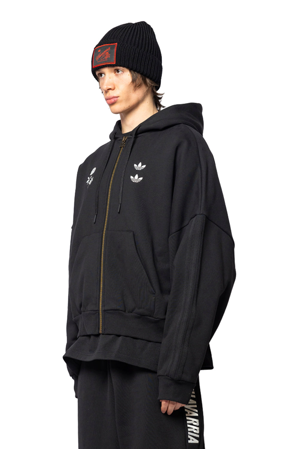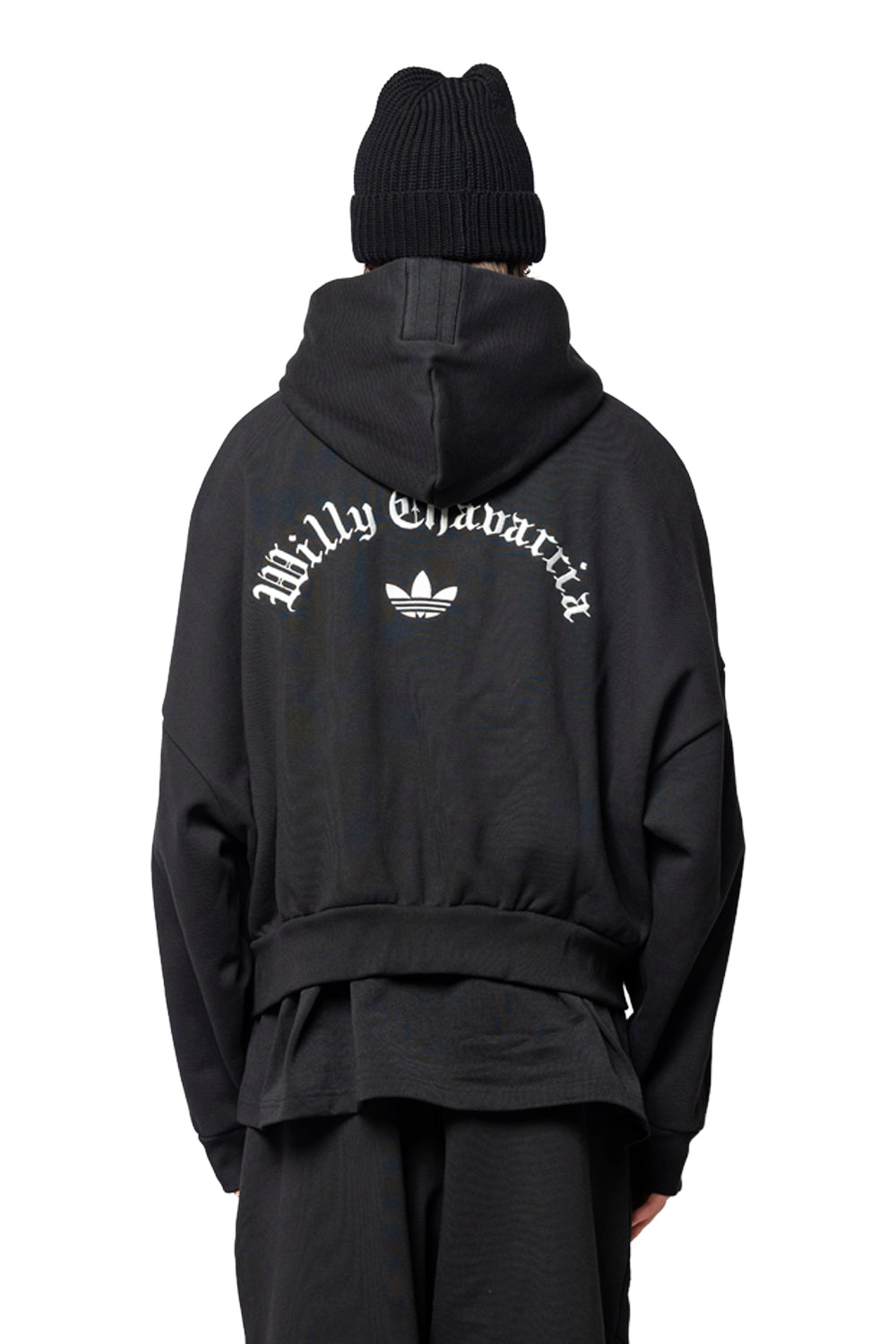 • Distinct branding: embroidered trefoil and Willy Chavarria wordmark with three stripes detailing on sleeves and hood.