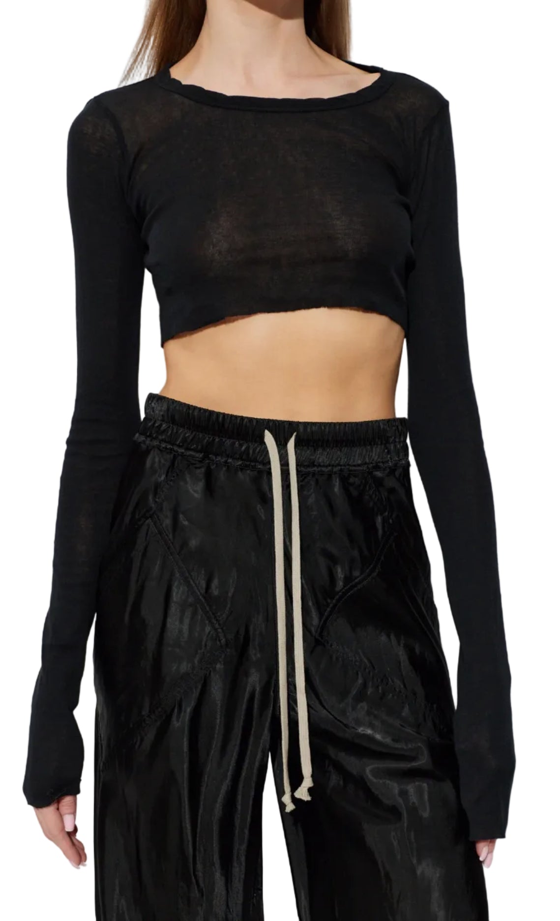 Introducing the LS CROP T in Black, a signature piece from Rick Owens that embodies modern luxury and disciplined craftsmanship. Woven in Italy from GOTS-certified organic cotton, this above-waist crop tee is cut for a slim, architectural silhouette with long sleeves and a round neck. The fabric is lightweight, semi-transparent, and exquisitely soft to the touch, a testament to meticulous sourcing and near-to-home production in Concordia, Italy. The garment bears Rick Owens' unmistakable design language—clean lines, a centered single seam along the spine, and raw hems at the cuffs and hem—creating a quiet, lasting statement rather than a fleeting trend.