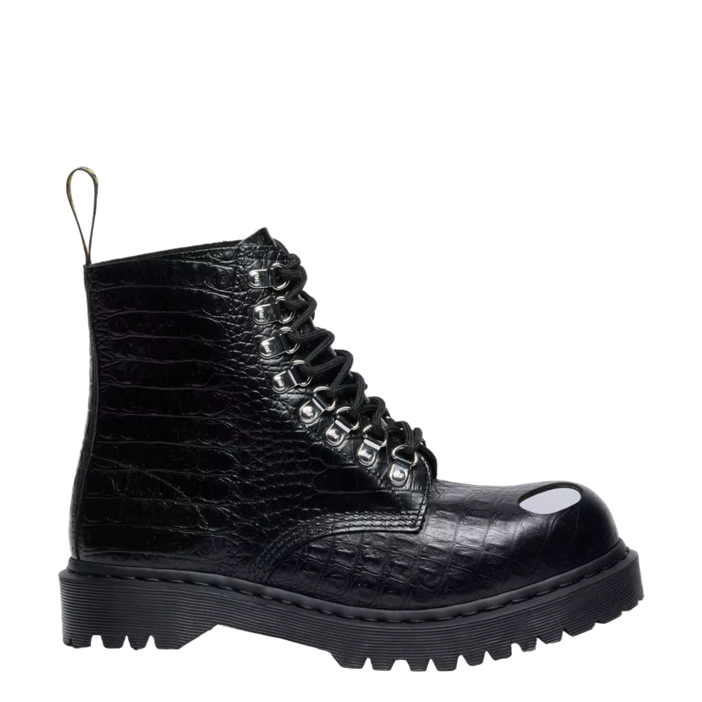 Dr. Martens presents the 1460 Pascal Bex Steel Toe Leather Boots in Black—a refined evolution of a cult classic. Built for durability and quiet prestige, this boot blends heritage with modern rigor. The upper is crafted from Analine Croc Emboss leather with a wax coat, developing character with wear. An off-center steel toe adds industrial edge, complemented by silver D-rings, black laces, and the signature yellow welt stitching with a scripted AirWair heel loop. Goodyear-welted construction seals the upper to a rugged Bex sole for lasting value.
